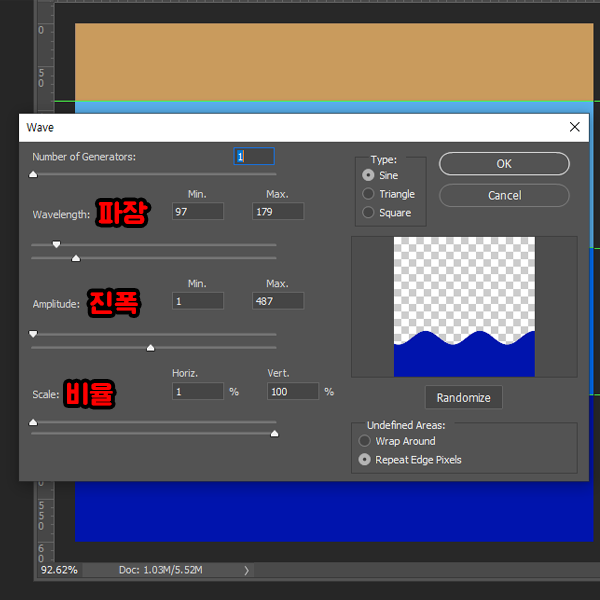 파장(Wavelength) / 진폭(Amplitude) / 비율(Scale) 을 오른쪽 미리보기에서 확인 하시면서 원하는 모양으로 조절해주세요.