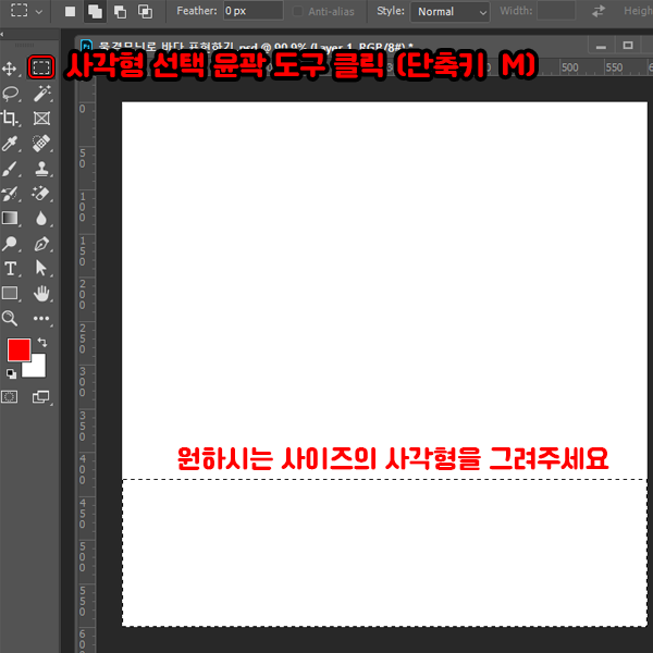 레이어1에 사각형 선택 윤곽 도구 (Rectangular Marquee Tool)를 이용하여 원하시는 사이즈의 사각형을 그려주세요. (단축키 M)